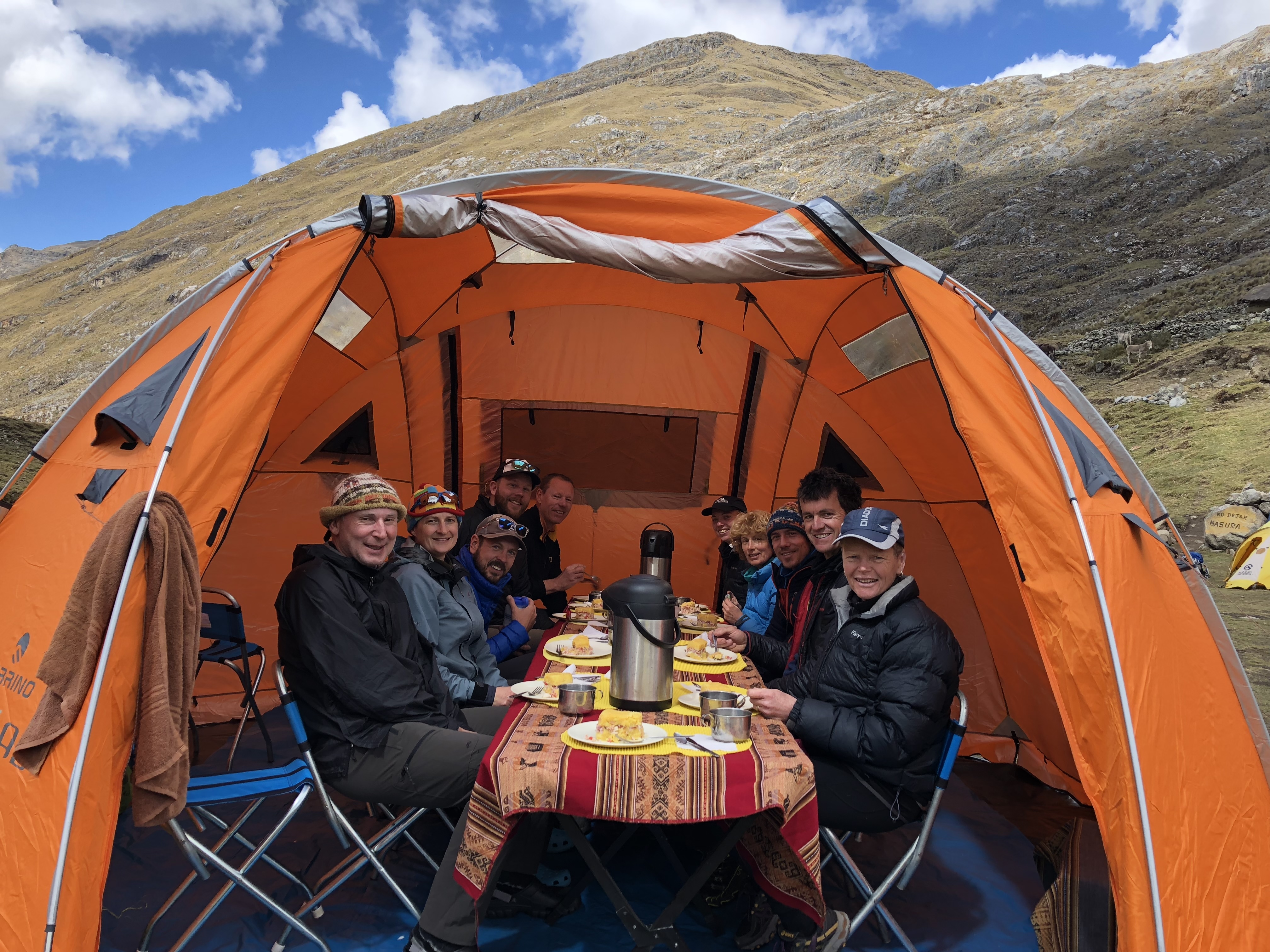 The trek reaches its highest point today as you climb to Cuyoc Pass (5000m). From this lofty saddle, the panorama takes in the Cordillera Huayhuash and neighbouring Cordillera Raura, a vast expanse of icy summits and glaciers. Descend to camp at San Antonio, a remote site nicknamed “Elephant Camp” for the distinctive rock formation nearby.