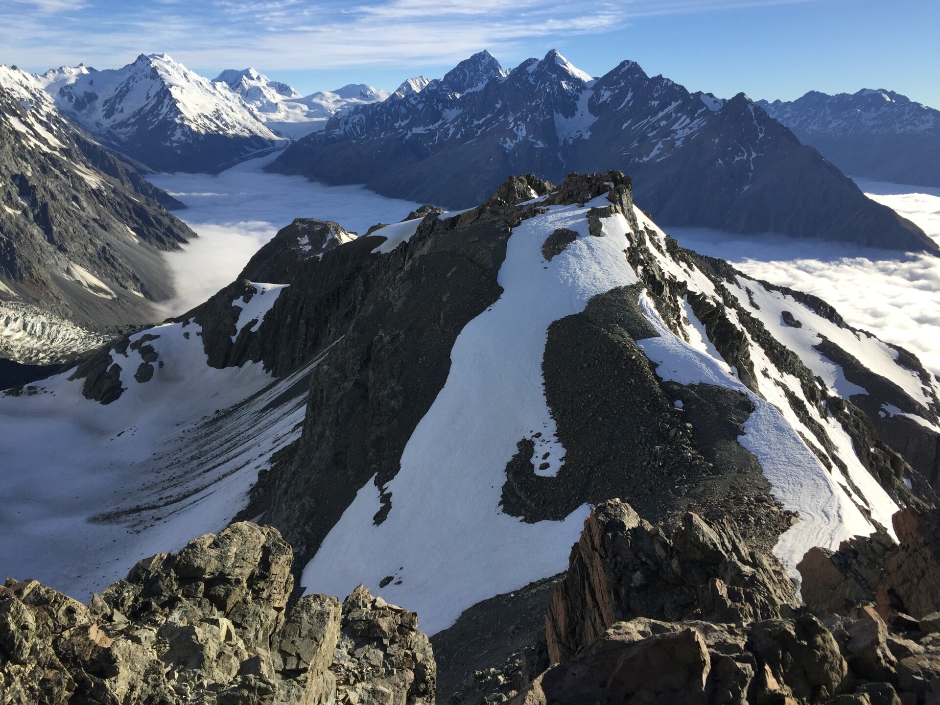 We climbed to Kaitiaki Peak (at 2222m). We were over the clouds and the views were unbelievable – especially the South Ridge of Aoraki/Mt Cook. I was incredibly proud of myself, there was no quivering lip for this young mountaineer.